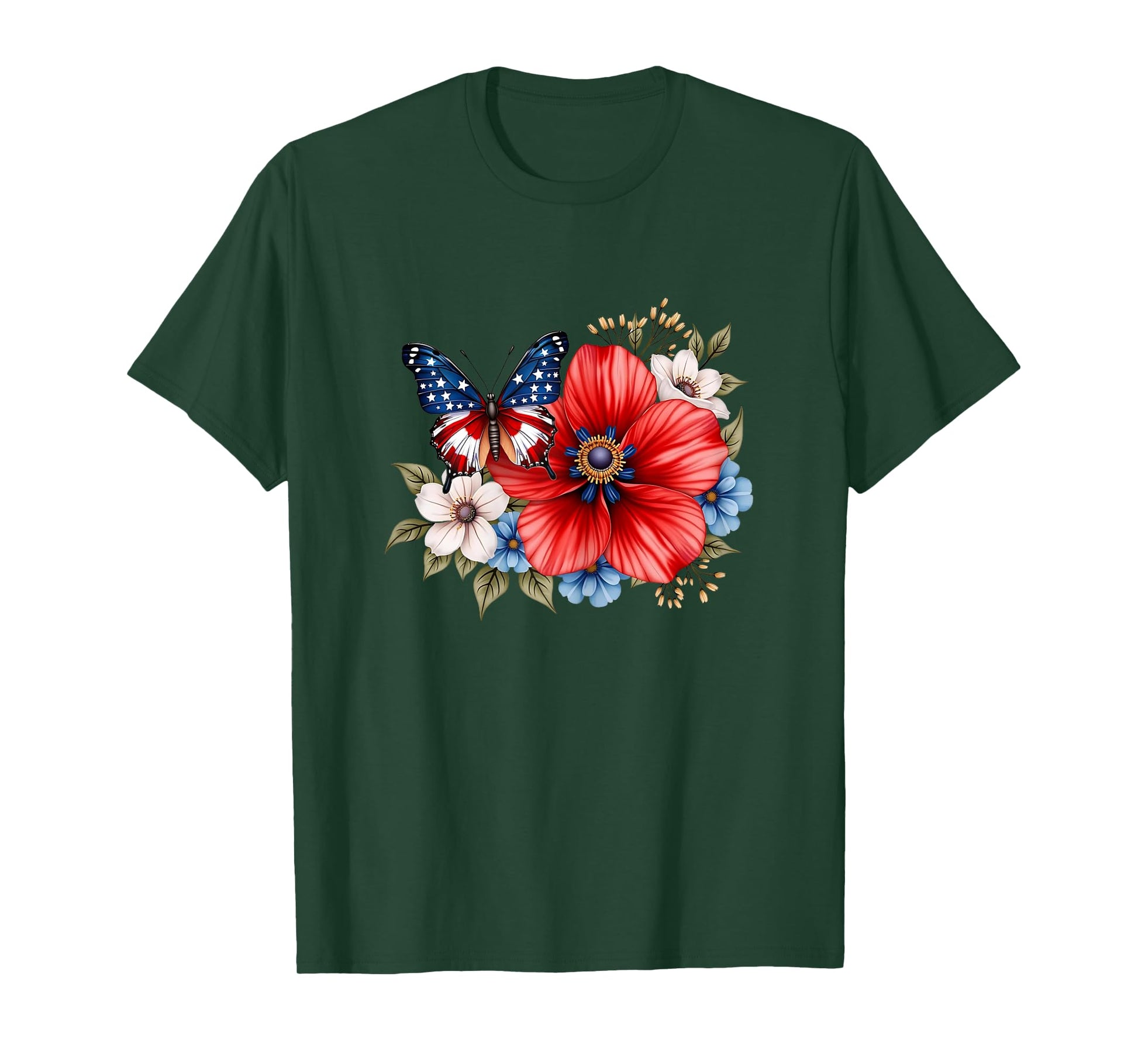 Butterfly Flowers American Flag 4th of July Women Girls T-Shirt