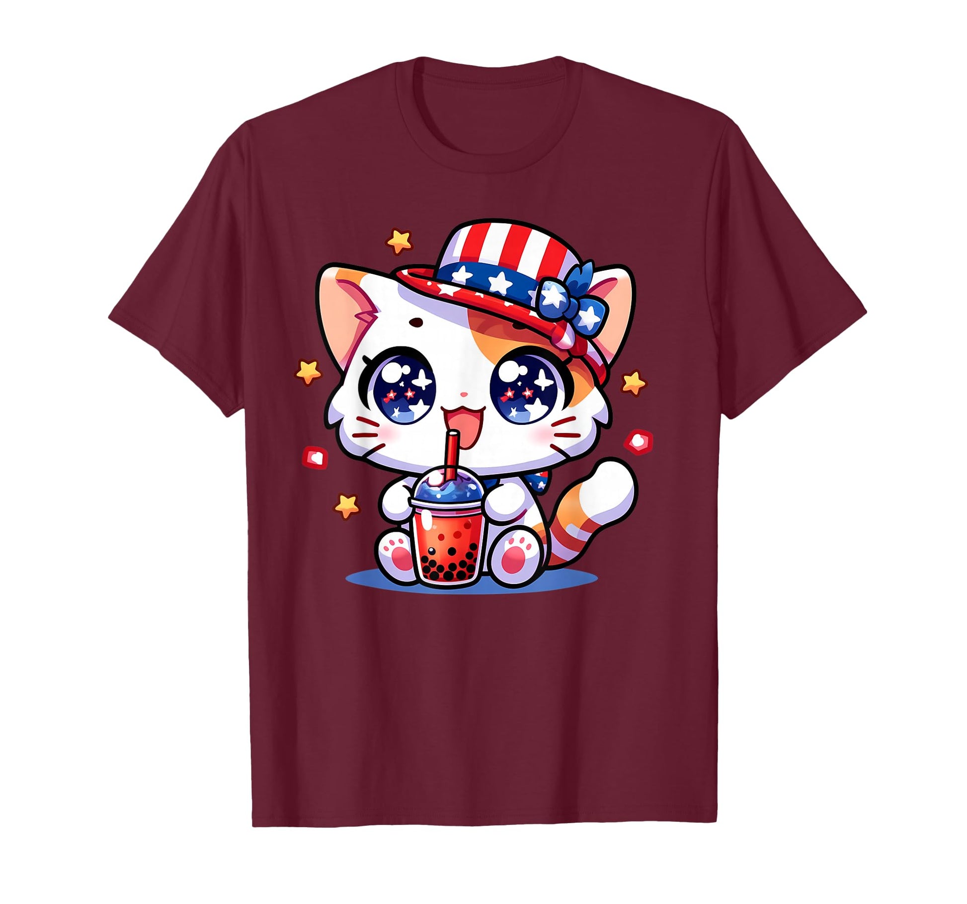 Cute 4th of July Cat Shirt Girls Kids Kawaii Anime Boba Tea T-Shirt