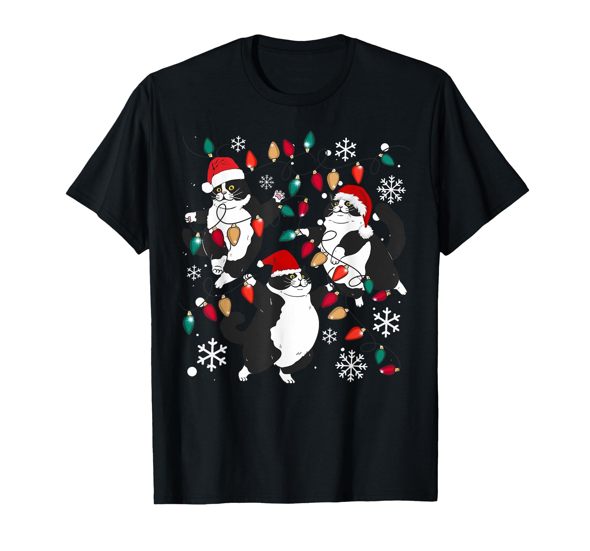 Tuxedo Cat Christmas Lights Meow Santa Xmas Pajama Cat Lover T-Shirt for Men Women Kids